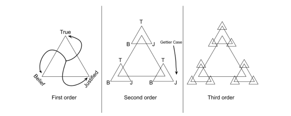 Each vertex of the triangle is supposed to be ‘true’ for something to be known to be ‘true’. Thus, each vertex has its own supporting triangle that verifies its ‘truth’, and each of those vertices have supporting truths so that we can ‘know’ it to be true. Accordingly, Gettier’s ‘end-all’ is just a second-order third axiom, referenced in the second pane of the diagram above, which in everyday english would translate to something like, ‘one justifies their belief in their justification of their belief’. Which is, of course, entirely different than the first-order justification of belief. I also theorize that one could forge Gettier problems for each of the eight other vertices that at the first level seem to be correct, but second order knowledge catches the trick.
