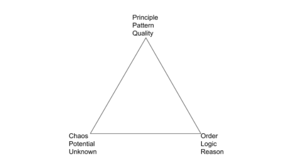 The Principle is something approaching Pirsig’s Quality. It is an event, possibly, an ongoing pattern that one can try to reach, but mostly observe and feel. The Principle is the end-all-be-all. Existence comes from it, and trickles down through time into Pirsig’s two modes of being, Classic and Romantic. Its PID equivalent would be the proportional factor, which is located in the here and now, without any other adjustments. The ‘flow’ mentioned above falls (currently, though I hope to change that) down through the two vertices in different directions. One passes first through Chaos-Potential and the other through Order. They are the feeling and observing sides respectively.