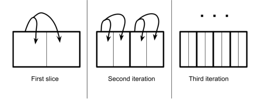 The analytic knife follows a pattern though, and I hope that in the greater context introduced on Peterson Diagrams, its movements will be shown to be impractical. The knife and its work is a form of re-entry, as defined by Louis H. Kauffmann in his paper on Self Reference and Recursive Forms. In the paper he puts forward the notation of a ‘self pointing arrow’ to assist in explanations (Kauffmann, 53-8). The diagram below outlines an example of this notation, in the context of the knife making a simple slice in half. The knife slices the original ‘thought’ in two, and then those two into two new parts, and so on ad infinitum.