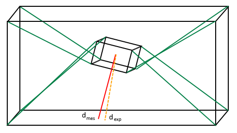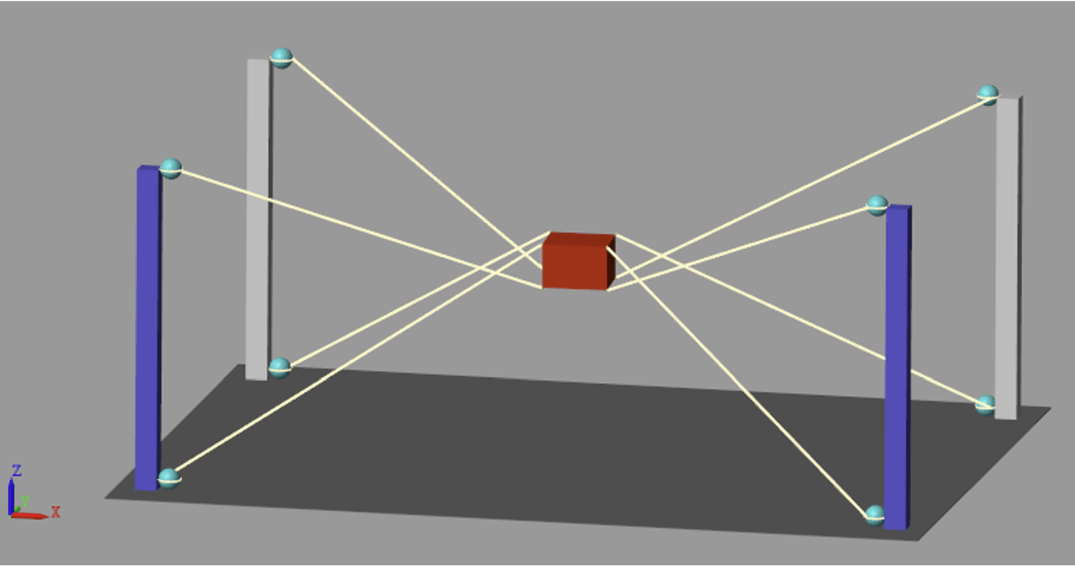 And finally, one of the most interesting parts of this project was trying to develop a calibration schema. One method that researchers have used is attaching a laser to the end effector, and then taking a sample of measurements over the workspace with high observability (relatively great leg/cable displacements) and then using a non-linear least squares fit algorithm to determine the best matched parameters for the CDPR, as there are always going to be manufacturing inconsistencies. This simulation was unable to replicate the success of previous researchers, and that is believed to be due to the rotation of the end-effector. Specifically, rotation about the vertical z-axis (yaw) causes displacement in the cables , which is not sensed by the laser pointing through the z-axis. As such, there is a great deal of ambiguity in position generated by yaw of the end-effector. However, it can be theorized that if one or more points for calibration are added to the end effector, rather than a single-dimensional linear measurement from a laser, that the calibration parameters could be accurately fit using numerical methods. See the picture below for the setup.