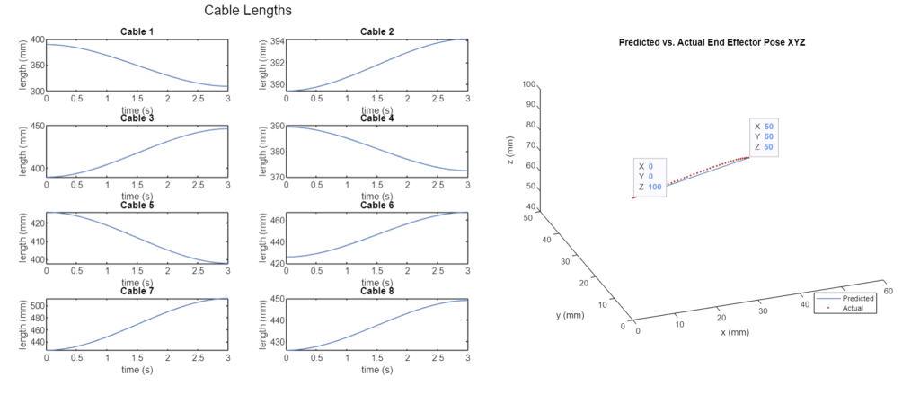 During my graduate studies in the class RBE521 – Legged Robotics, me and a partner developed a simulated CDPR with the intent of using it for 3d printing buildings as its notional context. Previous work by researchers in this field had proven quite productive, and so we decided to try develop and test a CDPR in Matlab using Simulink and Simscape. In the sketch above, one can see that the system under evaluation was of a rigid rectangular prism with 8 driven cables and a centrally located end-effector. The screenshot below (featured as the headline photo) shows the final implementation. On the left is the diagram showing the connections and driven effectors, and the right shows the simulated output.