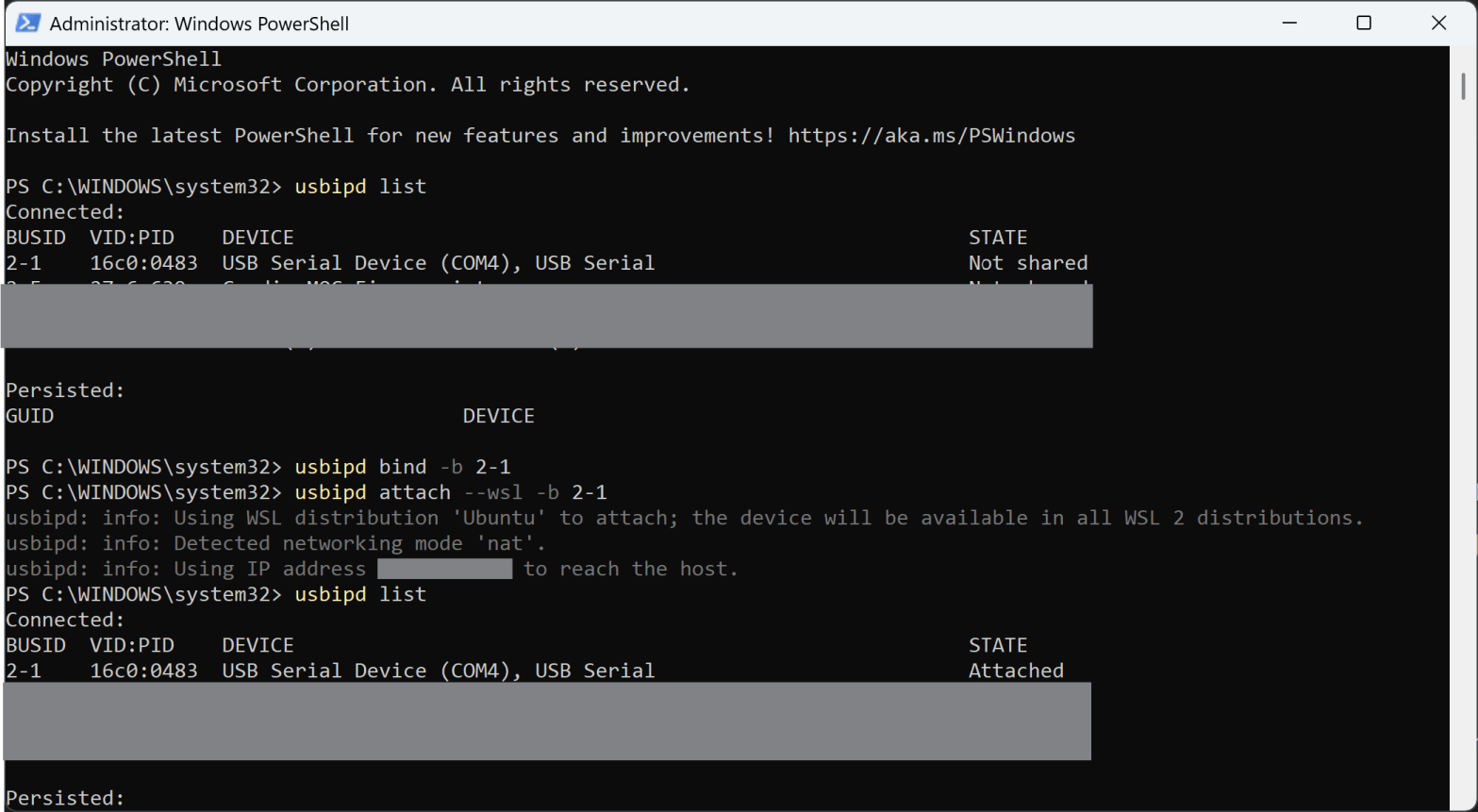 First, I get two powershells and launch WSL. I launch one more powershell with administrator privileges. In the windows admin, I bind the USB ports to WSL using the following. For your implementation, take the correct usb busid, identified using “usbipd list”.